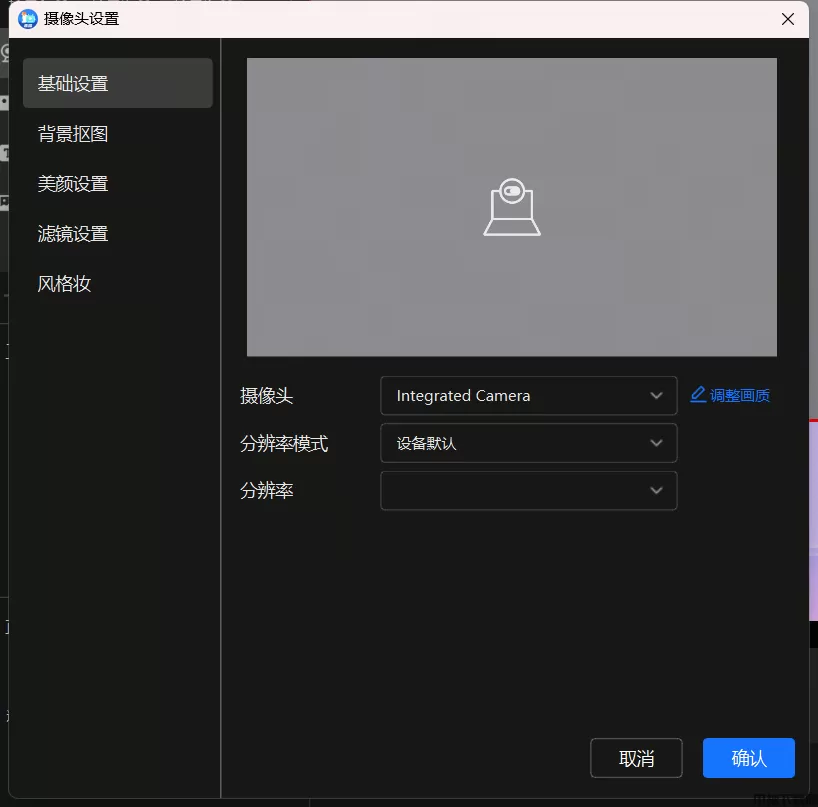 (1)点击添加“摄像头”,弹出【摄像头设置】弹窗。可进行分辨率设置、美颜、绿幕抠图、滤镜、风格妆的设置。