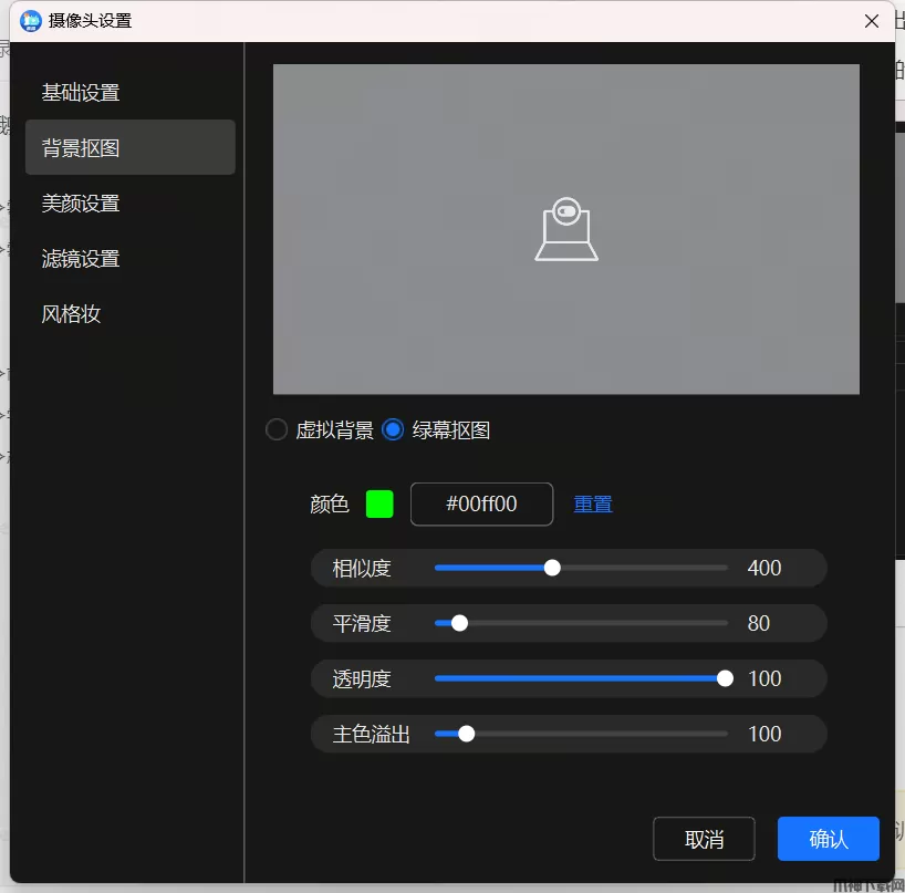 (2)绿幕抠图:选择颜色,可对摄像头内的颜色扣除,将画布内背景图露出。扣除颜色可在屏幕中选中,建议背景色为绿色、其次为红色、蓝色,上述三个颜色抠图效果较好。