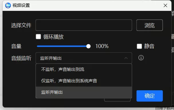 点击添加视频,可选择本地视频进行演示。默认“监听并输出”,若有重音,可选择“不监听,声音输出到流”。