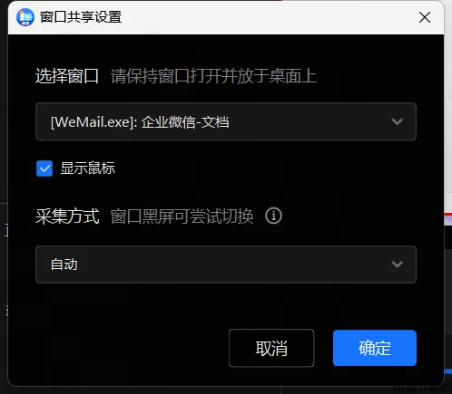 *选择共享窗口后,不建议放大或缩小等更改窗口分辨率的操作,可能导致黑屏。