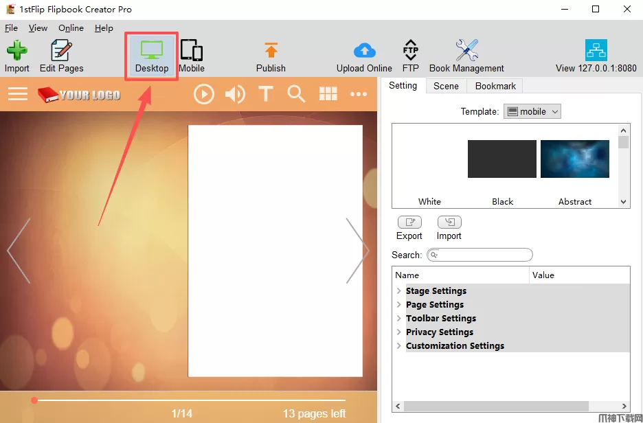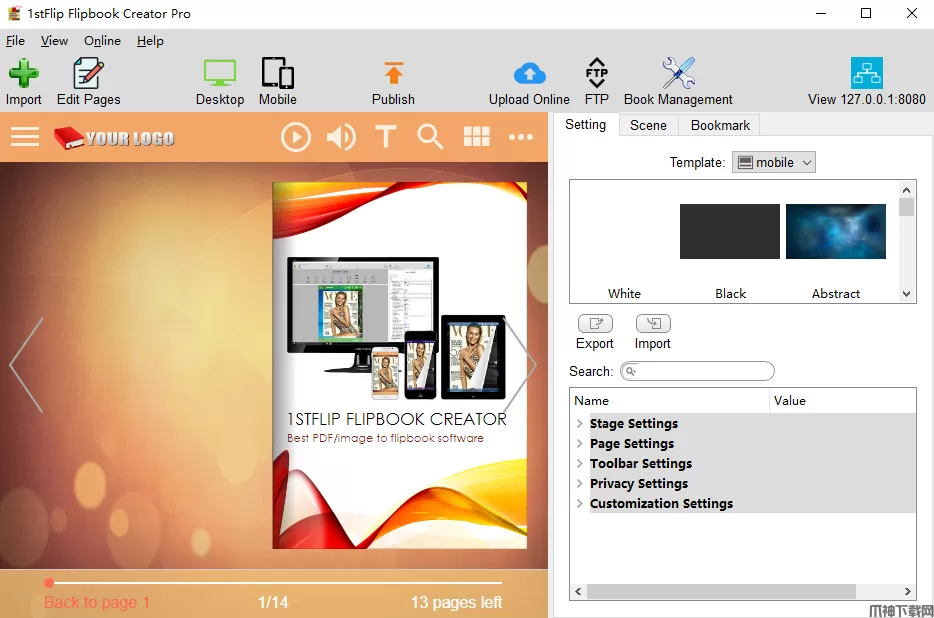 适用于Windows的1stFlip翻书软件可创建令人惊叹的HTML5和Flash电子书,其中包含可自定义的模板和动态场景。模板确定工具栏和图标在翻转页面的出版物上的显示方式,您可以自由更改它们。创建带有徽标,背景音乐,缩略图,缩放按钮,全屏按钮,自动翻转按钮,搜索按钮,选择文本按钮,语言可切换工具栏等的Flash页面翻转书。提供内置的动态场景供您选择。您还可以将图像和.swf文件设置为动画书场景。