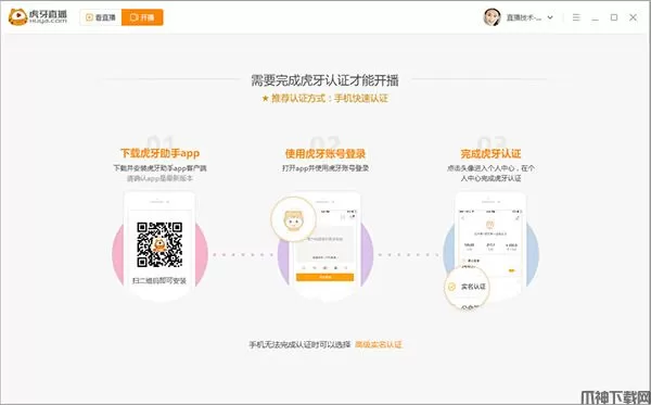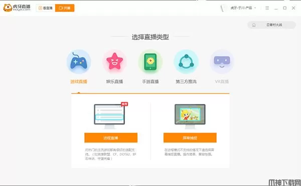 6、我们实名认证成功后就可以开始使用虎牙直播软件了,打开虎牙直播软件后我们需要选择你想要直播的模式,如:游戏直播、娱乐直播、手游直播、第三方推流、VR直播。