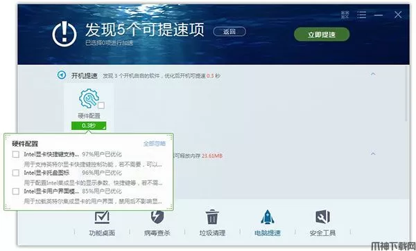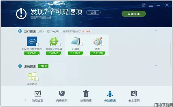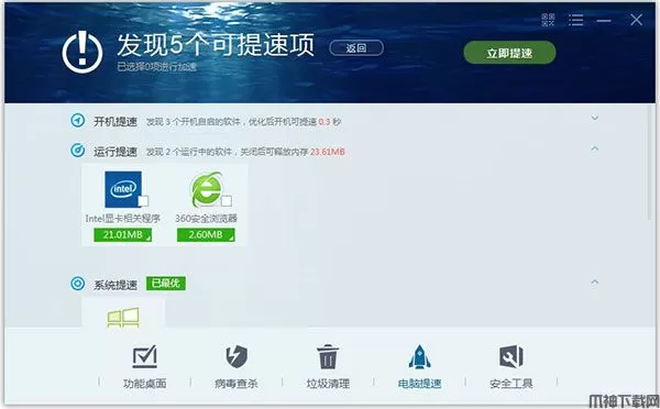 电脑优化功能主要分为四大模块:开机加速、网络加速、系统加速及垃圾清理。