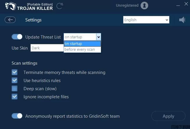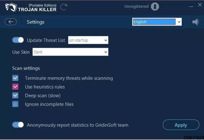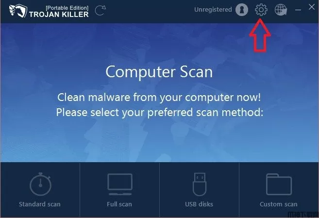 通过管理 Trojan Killer 中的设置,您可以更改程序界面的语言和颜色等常规设置,并对下一次扫描的运行方式制定附加规范。要打开设置,请单击设置图标。