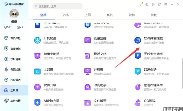 2、 点击打开工具箱,找到软件,在找到下载软件弹窗拦截并下载。