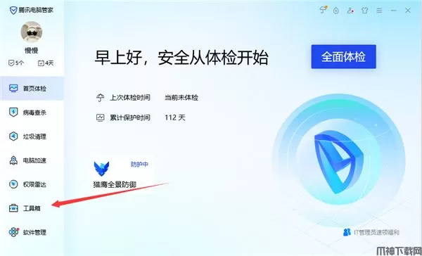 1、 先安装一个电脑管家在电脑上,然后点击左下角的工具箱。