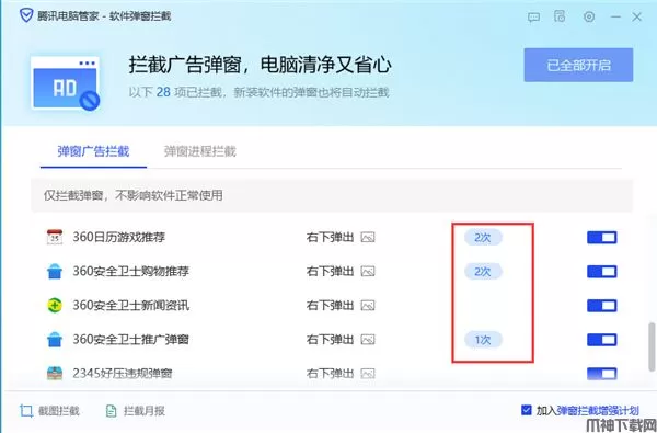 5、 拦截后,可以在电脑管家查看拦截的次数。