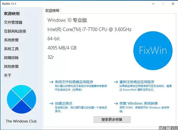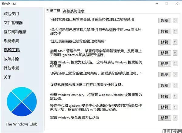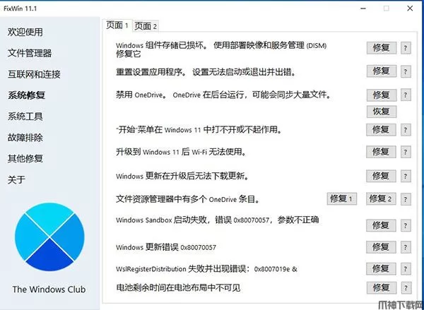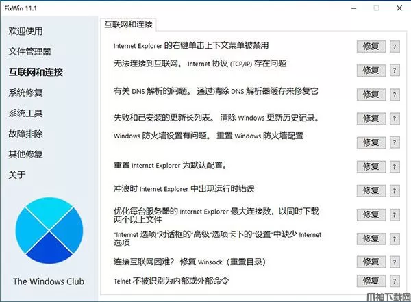 FixWin 11是一款专业的PC修复软件或Windows修复工具,只需单击一下即可修复 Windows 11/10 问题、烦恼和问题!FixWin 11为用户提供了丰富的修复功能,涵盖:文件管理器,互联网和连接,系统修复,系统工具,故障排