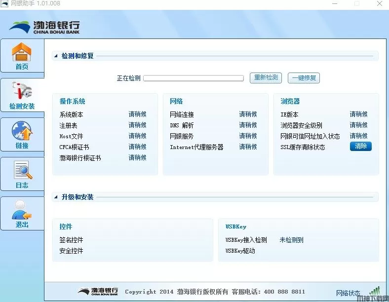 本功能提供一站式自动检测、修复和安装、升级网上银行系统所需的各种环境,如客户端设置、控件和驱动等。
