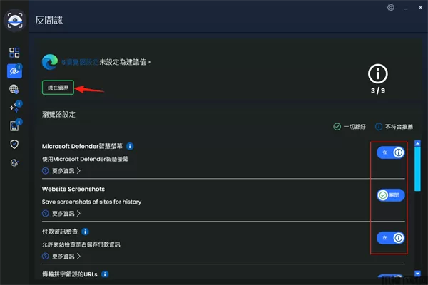 8、如果觉得需要一个个开关太过于麻烦,可以之间点击红框处,会开起所有保护,保护得分也会变成100,随后在根据需求是否关闭一些不需要的特定功能。