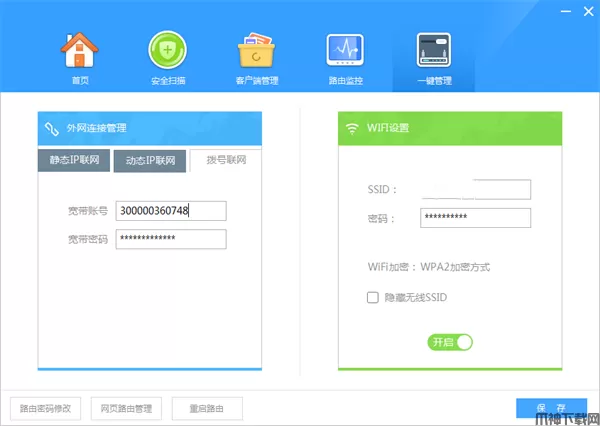 路由器联网以后,最重要的一件事情就是给WiFi设置密码,用户可以在路由管理功能下找到设置WiFi密码的地方。瑞星路由安全卫士默认WPA2的加密方式。在这里小编稍微解释下,目前市面上主流的路由器基本上都支持WEP、WPA及WPA2三种加密方式,其中WEP是许多路由器出厂默认的设置,但是这种加密方式极易遭到破解,黑客只需要在网上下载个破解工具,几秒钟就可以搞定密码。WPA2则是三种加密方式中最保险的一种,破解难度大且成本高,因此推荐使用这种模式。