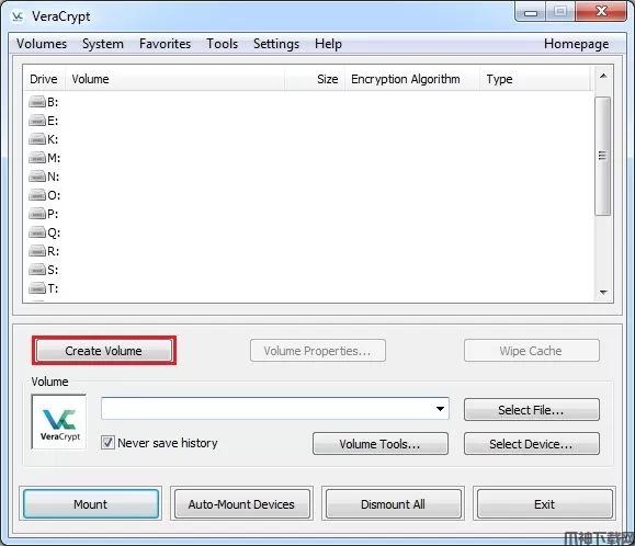 2、VeraCrypt 主窗口应该会出现。单击创建卷(为清楚起见,用红色矩形标记)。
