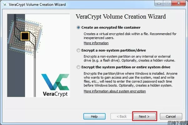 在这一步中,您需要选择您希望创建 VeraCrypt 卷的位置。VeraCrypt 卷可以驻留在分区或驱动器中的文件中,该文件也称为容器。在本教程中,我们将选择第一个选项并在文件中创建一个 VeraCrypt 卷。由于默认情况下选择了该选项,您只需单击Next 即可。注意:在以下步骤中,屏幕截图将仅显示向导窗口的右侧部分。