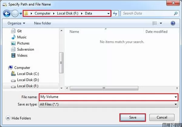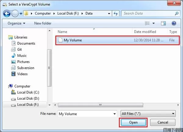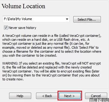 6、在本教程中,我们将在文件夹 F :\Data\ 中创建我们的 VeraCrypt 卷, 卷(容器)的文件名将是我的卷(如上面的屏幕截图所示)。当然,您可以选择您喜欢的任何其他文件名和位置(例如,在 USB 记忆棒上)。请注意,文件 My Volume尚不存在 – VeraCrypt 将创建它。