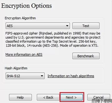 8、您可以在此处为卷选择加密算法和哈希算法。如果您不确定在此处选择什么,您可以使用默认设置并单击 下一步(有关更多信息,请参阅加密算法和散列算法一章)。