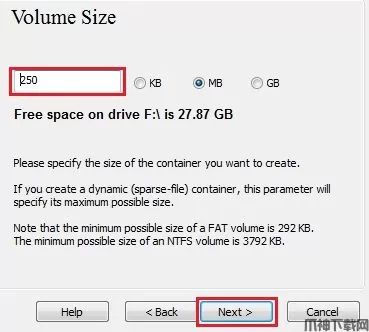 9、这里我们指定我们希望 VeraCrypt 容器的大小为 250 兆字节。当然,您可以指定不同的大小。在输入字段(标有红色矩形)中输入所需大小后,单击 下一步。