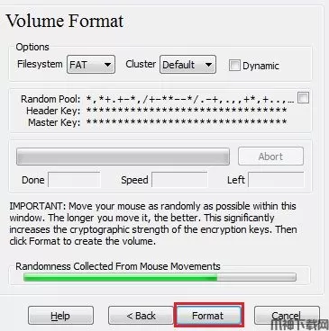 11、在 Volume Creation Wizard 窗口中尽可能随机地移动鼠标,至少直到随机指示器变为绿色。移动鼠标的时间越长越好(建议移动鼠标至少 30 秒)。这显着提高了加密密钥的加密强度(从而提高了安全性)。