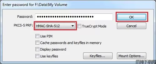 18、选择在创建卷期间使用的 PRF 算法(SHA-512 是 VeraCrypt 使用的默认 PRF)。如果您不记得使用了哪个 PRF,只需将其设置为“自动检测”,但安装过程将花费更多时间。输入密码后点击确定。