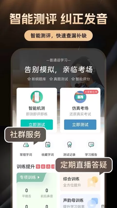 软件模拟与国家普通话考试测试平台,严格按照国家语委规定组题,可深度体验普通话水平测试完整测试流程,测试考试完整试题,如临真实考场,消除对考场的陌生感,让你考试更加从容自信。多维口语分析报告,视频纠正你的普通话发音不足。
