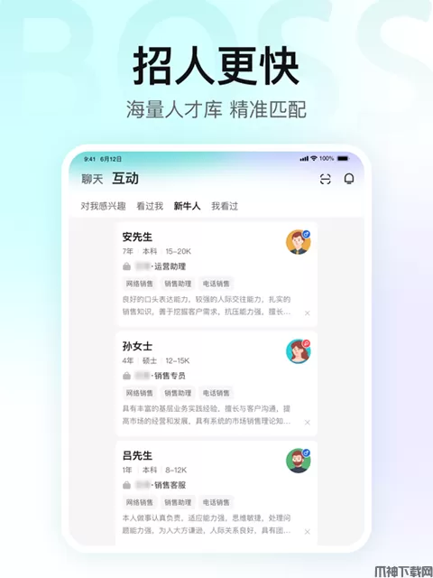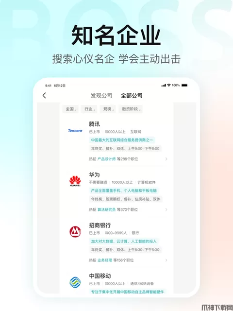 Boss直聘ipad版是一款互联网时代的招聘神器,你还在通过一轮轮的面试找工作吗,有了Boss直聘,让你轻松对接企业高管,直接与boss开聊。如果谈不来,那就直接换boss。软件为广大应聘者提供海量工作岗位,日均60万的在线职位等你。软件致力为企业和应聘者进行自动精准匹配,软件只需登记注册一个账号,可以用软件制作一个具有个性化的简历后就可以直接与招聘boss开聊啦。目前有超多知名企业高管都在这里发布了职位,例如阿里巴巴、百度、美团、华为、果壳、网易、知乎,还有新锐公司都一网打尽,超多高薪职位等你来应聘哦。