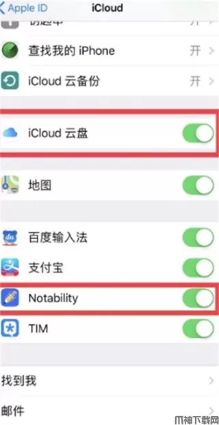 3、进入之后,找到icloud云盘然后开启右侧的滑块,在找到notability的“开启右侧的滑块”。