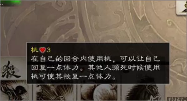 3、基本牌:就是可以使用杀和闪的牌。杀就是向一个武将,发起进攻,如果对方没有闪的话,就可以扣掉对方一个生命值。还有桃,可以回复一滴生命值。