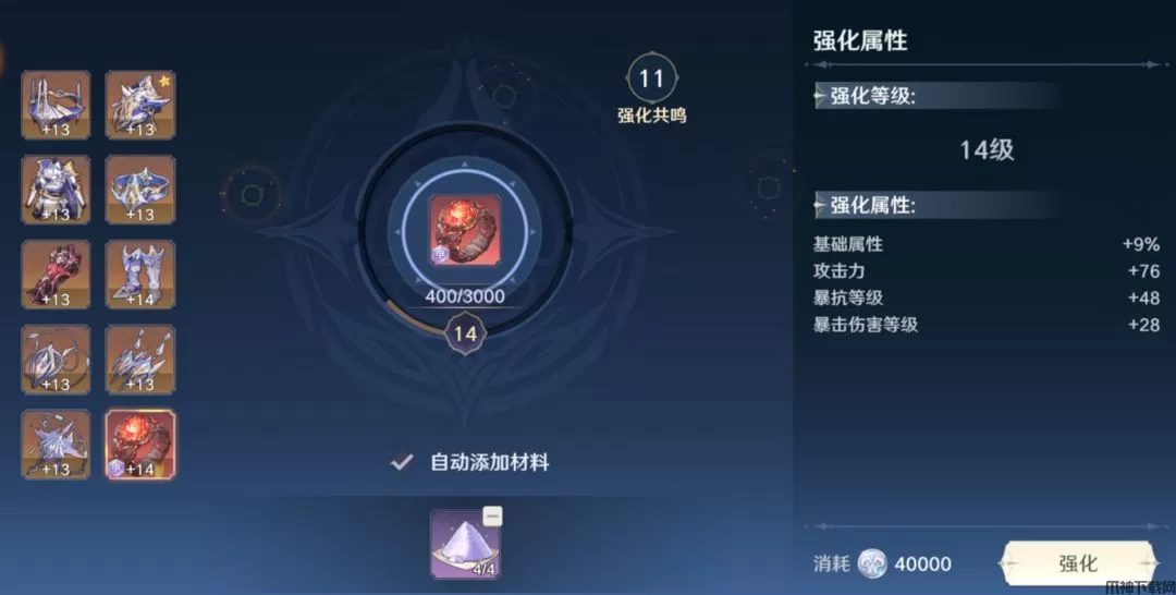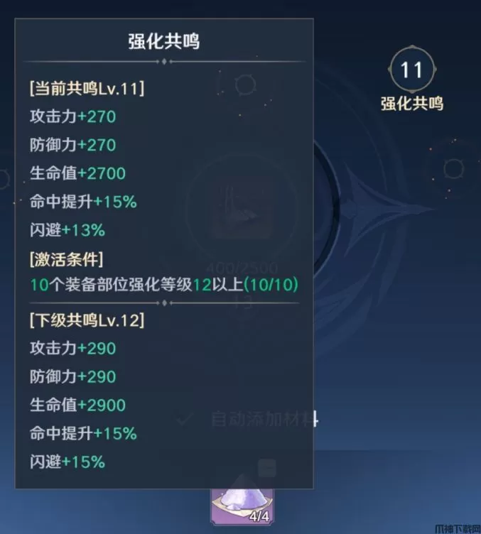 而强化则是字面意义上的强化装备,提高属性。其中值得注意的是【强化共鸣】,这个共鸣条件要求全体装备都达到指定等级才能激活,因此相较于只强化一个部位的顾此失彼,面面俱到地全体强化更为划算哦!