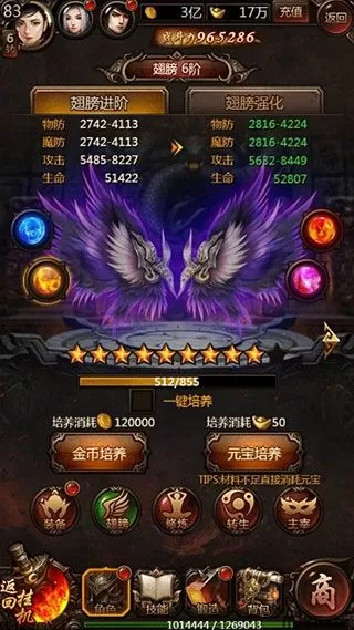 2、翅膀可以为人物提供属性加成,通过培养、升级翼窍、强化这三种方式可以进一步提升属性。其中培养需要消耗羽毛,玩家可以通过挑战羽毛副本获得,又或者使用金币或元宝代替羽毛。