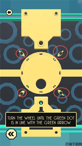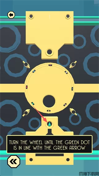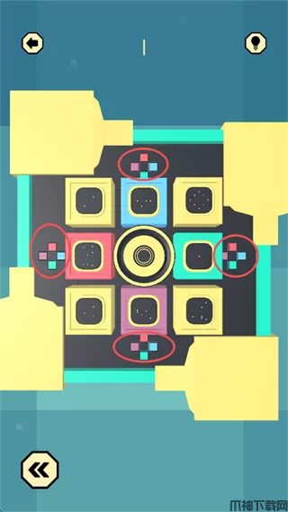 8、观察上下左右四个方向的“颜色对应方向”,并通过点击屏幕中间的“黄圆形标识”控制大型的四色方块,颜色方向对应“四周的小颜色方向”。