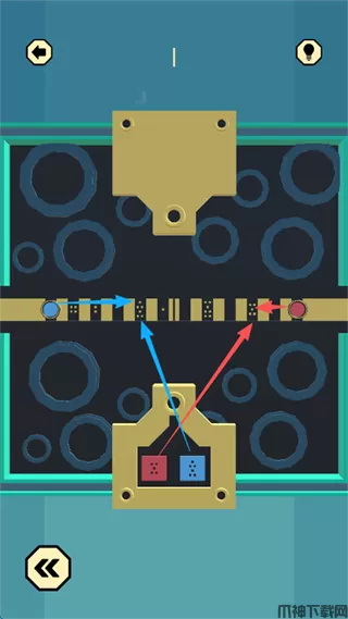 7、观察屏幕下方的“红蓝方块的空洞形状”,在上方寻找相对应的“黄点标识”,随后将相应颜色的“红蓝圆形”移动到相应的“黄点标识”。
