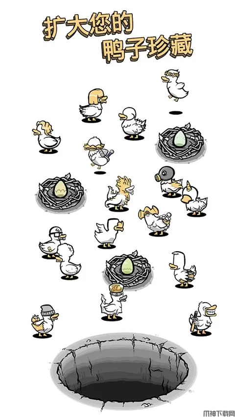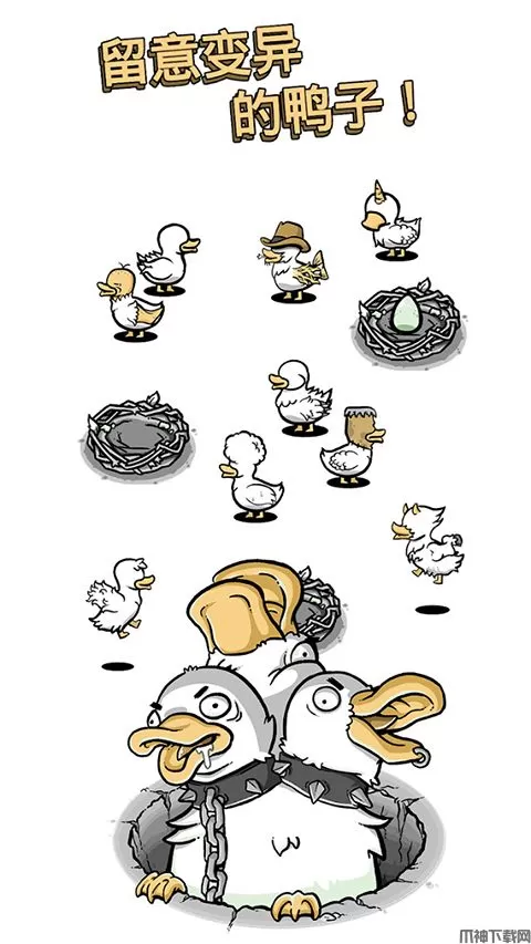 怪鸭世界是一款以鸭子为题材打造的休闲益智类模拟小游戏。并且游戏以经典的黑白风格元素设计为主打,不仅拥有着清爽简约的游戏界面、丰富多样的场景动画、以及逼真的技能特效效果,可让大家能够感受全新与众不同的视觉盛宴。同时游戏中丰富的鸭鸭种类更是形象诙谐,呆萌有趣,且每只鸭子都有不同的技能。在这里你不但可以通过不断的孵化基因变异的鸭子来进行培养和成长,并将其放进神秘洞中触发奇特的惊喜,获取更多不同的鸭子奖励,集齐鸭鸭图鉴满足你浓厚的收藏欲。而且在怪鸭世界游戏中随着更多的鸭子的孵化,过程中也还会发生更多奇怪的事情,出现许多隐藏的关卡等你来挑战,参与到各种不同的合成中,随时随地体验鸭子的乐趣,了解鸭子,拯救鸭子。