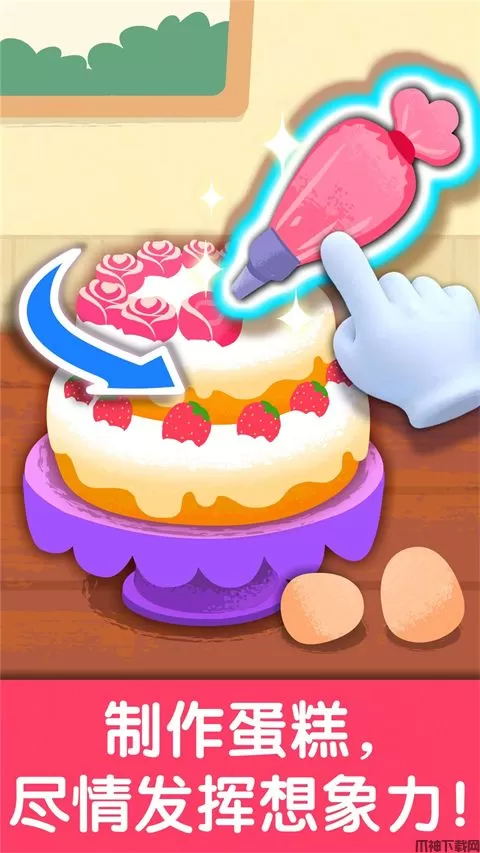做生日蛋糕喽。碗里加入鸡蛋和面粉,搅拌均匀后放进烤箱。草莓or巧克力?选择喜欢口味的奶油吧。别忘了还可以用樱桃、糖果来装饰蛋糕哦!