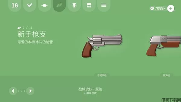 5、在帽子图标旁边的枪图标,可以购买和更换枪支,有7页的枪支可以选择。