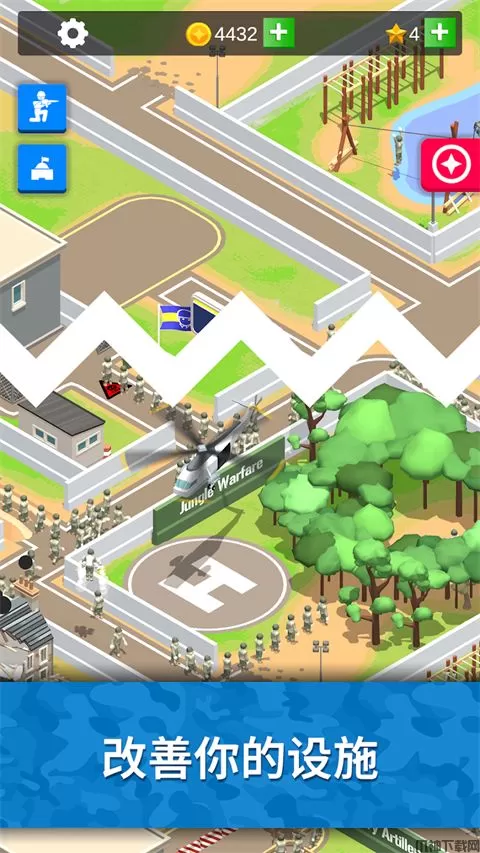 随着基地中的军事训练逐步进展,你将获得金钱并扩张营地。你可以升级所有训练区的数值、速度、容量和队列规模。虽然过程如同过山车般起伏跌宕,但懒惰的学员必将遭到淘汰——你会爱上发展和升级你的军事基地。