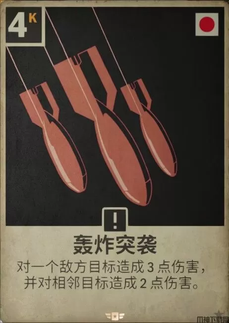 3、轰炸突袭。这张卡在老版本中是作为新手战役中赠送的金卡,而现版本已经被替换为了第2挺近旅。这张卡不仅是一张直伤卡,更是可以在必要时刻进行解场,同样也是一张日本通用金。