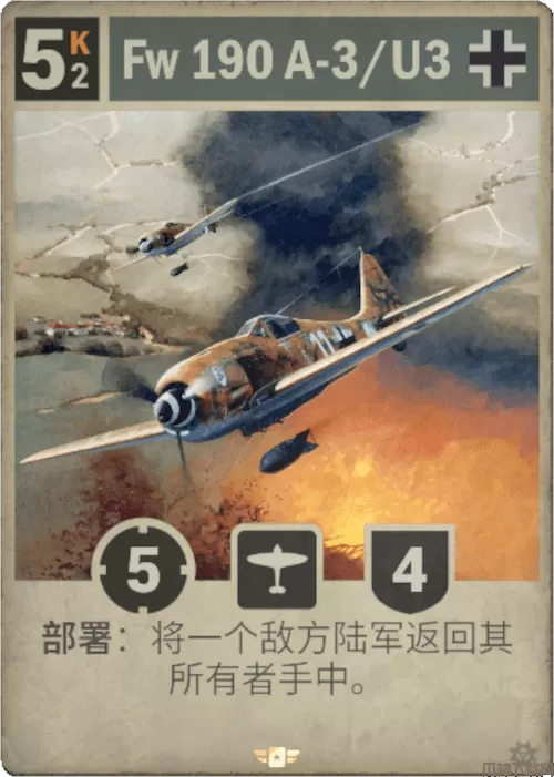 3、Fw 190 A-3/U3。和彗星一样,这张卡也是一张德国通用卡,返手效果加上5/4的身材使得中期既能解场,又能站场,缺点是只能返手陆军,但是依旧很强。