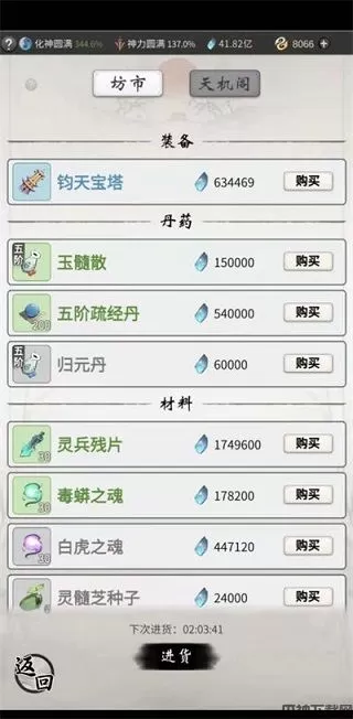 经过老板娘芸娘的潜心经营,此坊市如今是清虚观内最大的坊市。从装备到丹药,坊市里应有尽有。若哪天走运,还能遇到稀有的材料,买到即赚到呀。