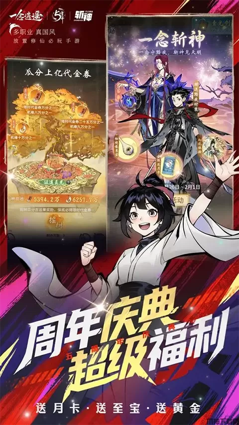 《一念逍遥》五周年超级版本将在1月26日陆续上线,全新斩神主题服,解锁【诸神隐域】新玩法。全新社交玩法“万界天渊”,养成仙舟争夺更大战场!更有周年超级福利,至宝、月卡,代金券通通赠送!
