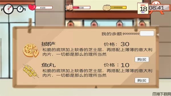 3、当体力能量不足时需要到商店买免费的便当、披萨、鱼丸来补充体力和精力。