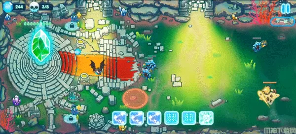 小兵出现就直接放地上,束缚随机应变,最好是给巨人,这关最恶心的其实是那个巨大史莱姆,他吐出来的小史莱姆会跳过防线,直接跑到水晶面前,如果你放技能打,那就完全是浪费技能,很可能导致后面没技能用,所以我一般都是直接秒。