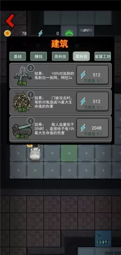 炮台:首先我们一开始进入到游戏中,最实用的道具莫过于炮台了,它可以攻击猛鬼并造成不菲的伤害,初期炮台的攻击力是4,攻击距离是4,可以通过升级来增加炮台的攻击力与攻击距离,麻麻再也不用担心我被猛鬼抓住了,放置需要8个金币。