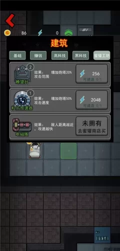 游戏机:在炮台的正下方就是游戏机了,它的作用是每2秒生产一个闪电,闪电可以放置其他的道具,列如:赚钱、高科技、黑科技、蜜獾工坊之类的道具,放置需要200个金币。