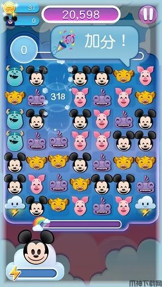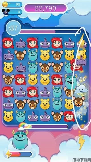 2、游戏开始后跟其他游戏一样滑动三个表情一样即可消分。不过四个可以产生带闪电的云它会消除一行。