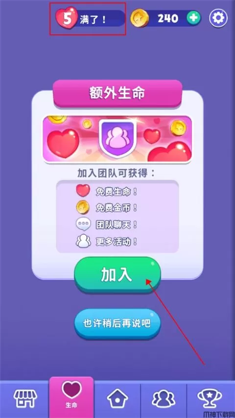 7、玩家在游戏中挑战关卡需要消耗生命力,加入团队玩家还可以获取额外的生命力哦。