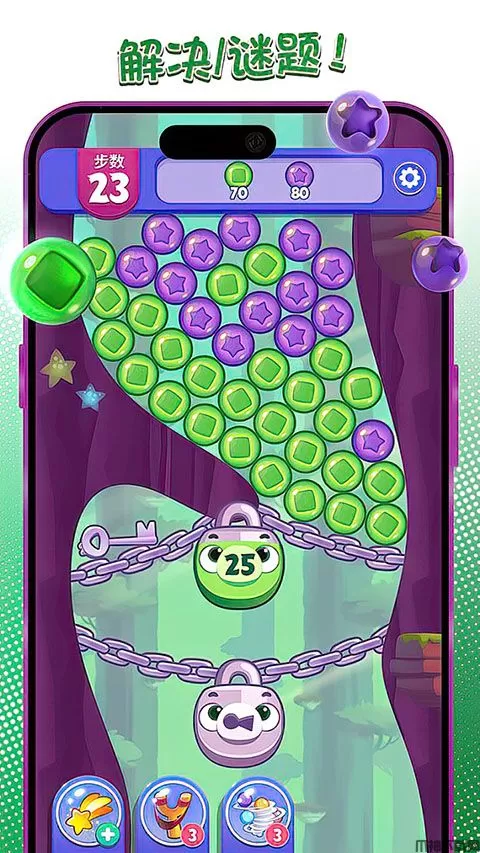游戏有上百个关卡,每个关卡都有不同的道具和障碍物。玩家可以使用道具来消除,从而获得更多的积分,消除时,还会产生非常震撼的操作效果,给玩家视觉上的震撼,经典的题材,全新的游戏体验,玩家需要打破泡泡来获取奖励,不断的完成各种挑战。