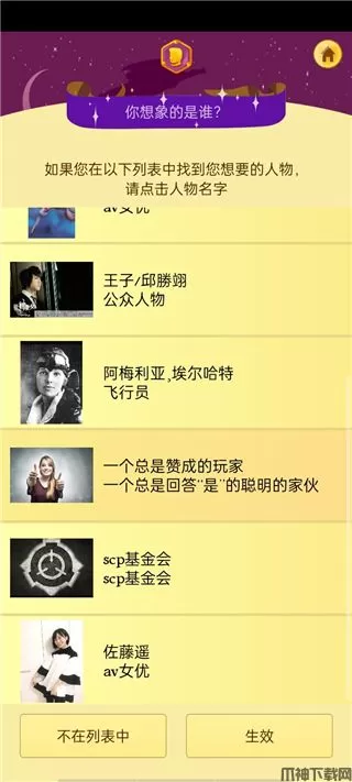3、一共7个问题,当年回答完了,神灯将猜测你心目中所想的人物。