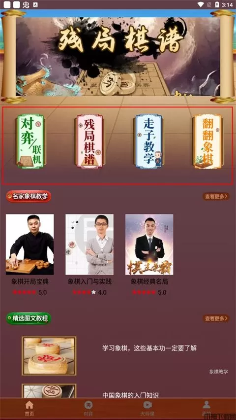1、进入首页,首页有象棋玩法(对弈、联机、残局等),图文教程,棋谱等,点击大师课;