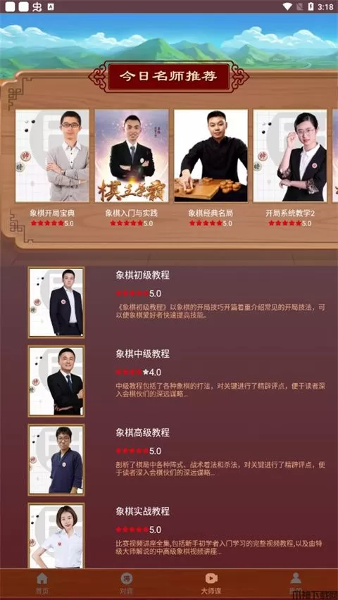 2、进入大师课页面,用户可查看每日名师推荐课程、象棋各级教程等,点击课程;