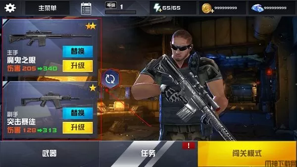 右侧则是玩家要扮演的人物,下办部分从左到右依次是,武器、任务和闯关模式。