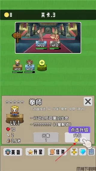 3、当有多余的资源时可以对勇者进行升级,每次世界都可以大幅度提升属性能力。